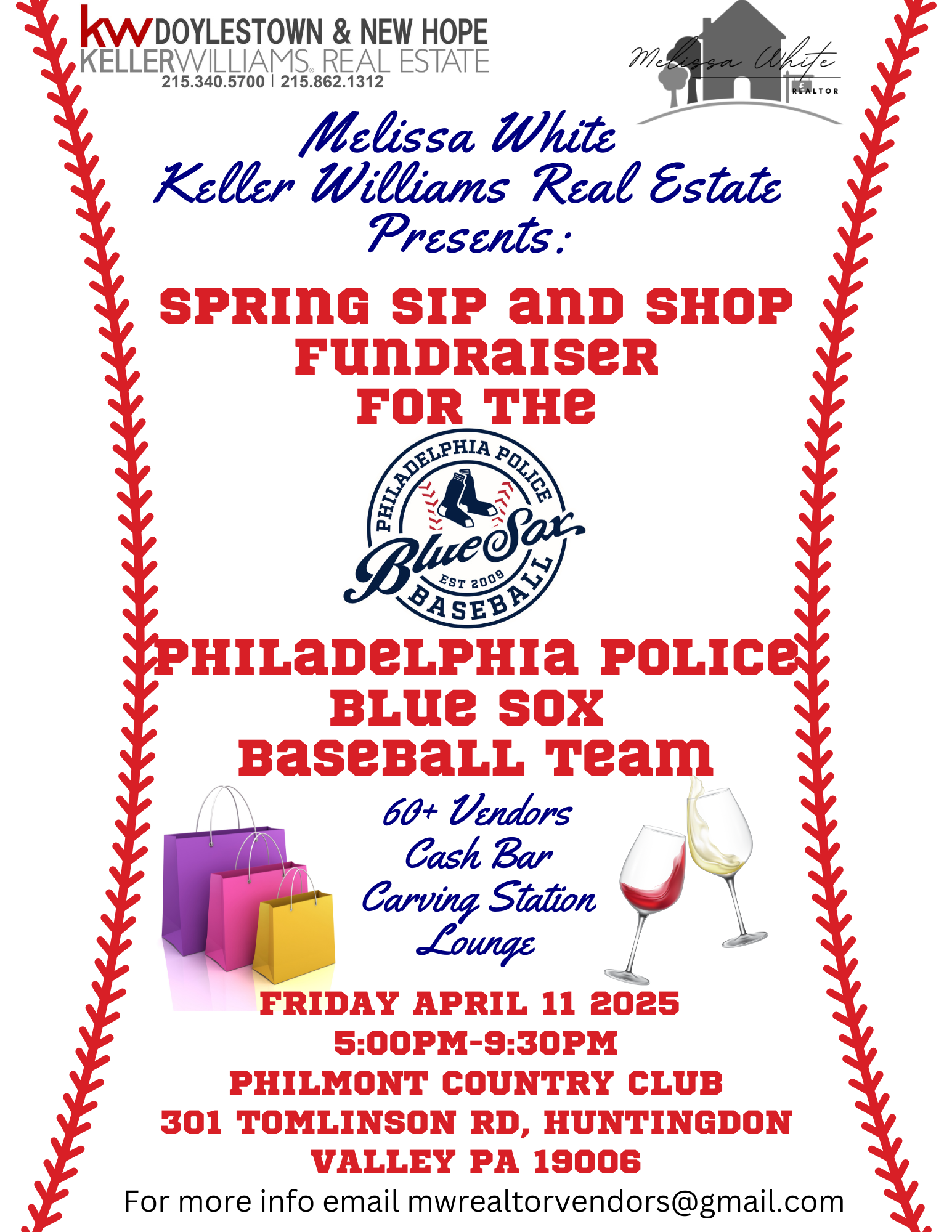 Event: Spring Sip and Shop Fundraiser for the Philadelphia Police Blue Sox Baseball TeamPresented by: Melissa White, Keller Williams Real EstateDate: Friday, April 11, 2025Time: 5:00 PM – 9:30 PMLocation: Philmont Country Club, 301 Tomlinson Rd, Huntingdon Valley, PA 19006Features: 60+ Vendors, Cash Bar, Carving Station, LoungeFull Event Details: https://www.facebook.com/events/971126608240217